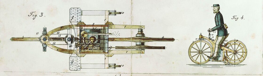 Das Motorrad basiert letztendlich auf dem Fahrrad. Im ersten Teil ging es um angetriebene Räder und einspurige Zweiräder. Aus der Kombination von beiden entstand das Fahrrad wie wir es im Prinzip heute noch benutzen. Inzwischen war aber auch der Verbrennungsmotor erfunden worden. Und da war natürlich der Gedanke nicht allzu fern, sowohl die Kutsche als auch das Fahrrad zu motorisierten.